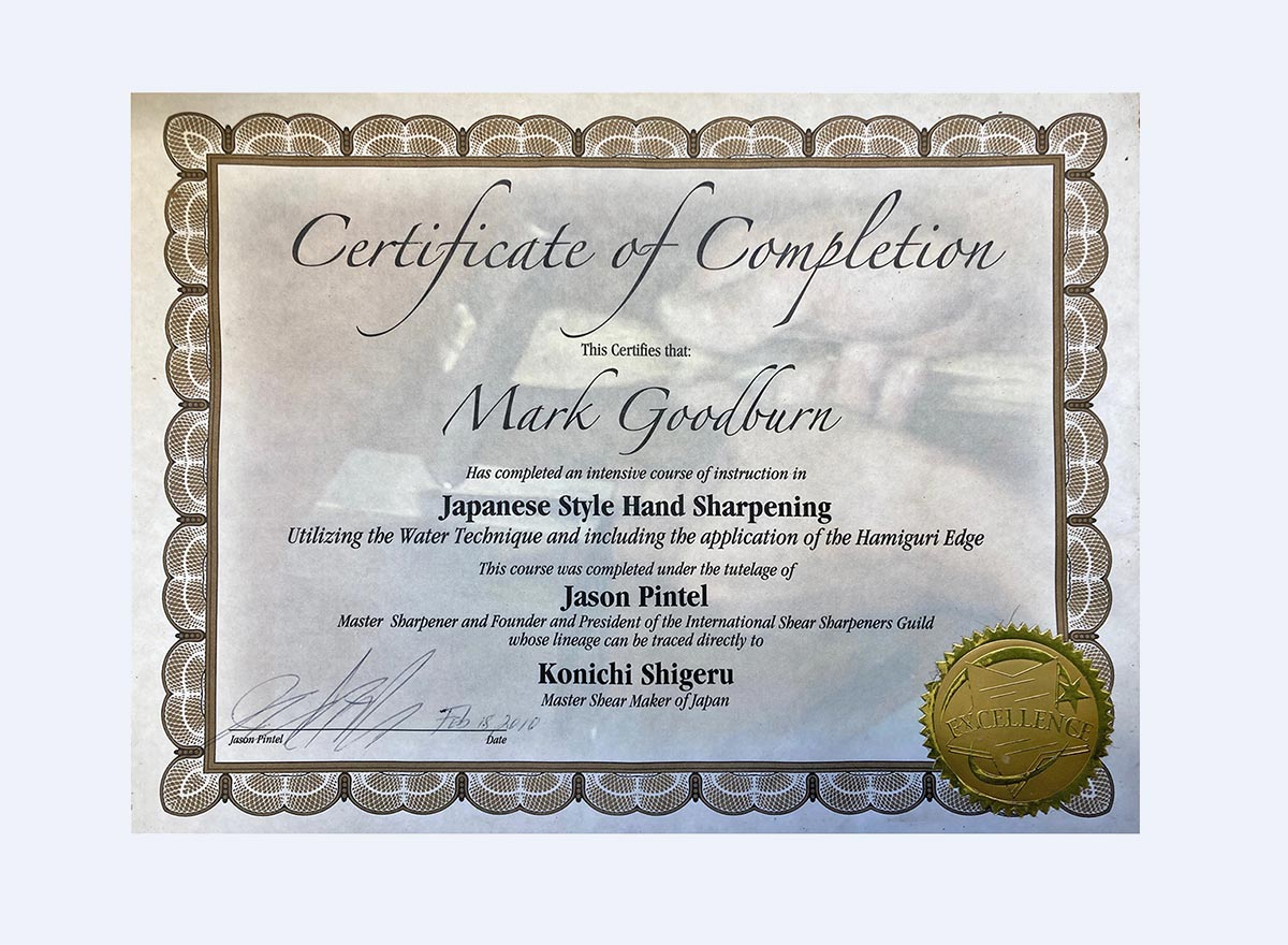 Established in Canada in 2009, Mark Goodburn undertook and completed a professional scissor sharpening training course in Califonira USA. Mark has also attended several seminars run by the national beauty sharpeners association (USA) and also trained as a Japanese Hand Style Precision Sharpener in California. Whilst in the United States Mark also trained in clipper/trimmer blade sharpening.