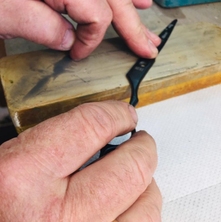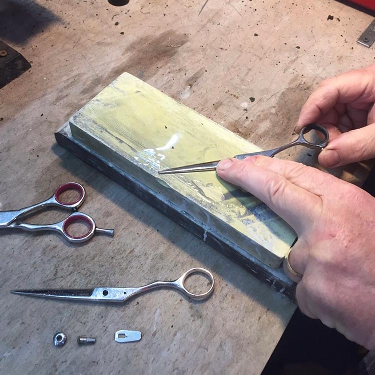 Mark's training involved the sharpening of high-end beauty scissors, incorporating "Japanese" style sharpening techniques using flat hones (not grinders), whetstones and strops. This results in an extremely sharp and highly polished convex edge scissor. "German" style bevelled edge scissors are also sharpened in a similar manner to achieve the same results.